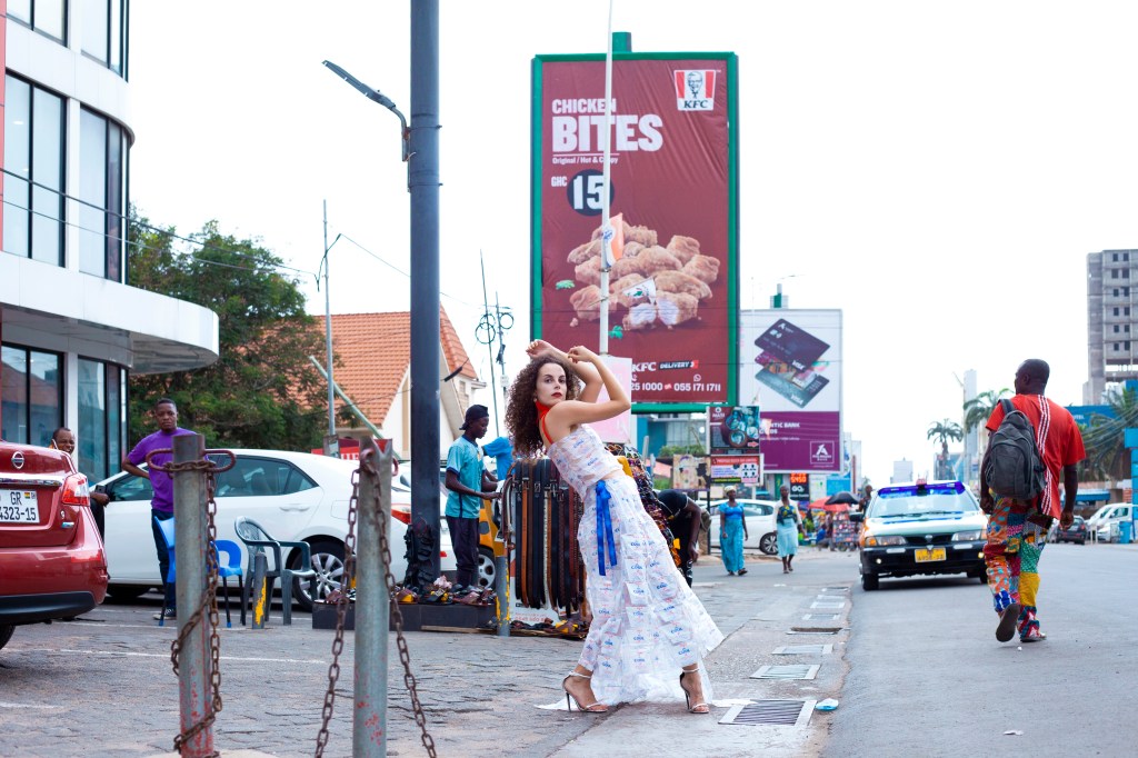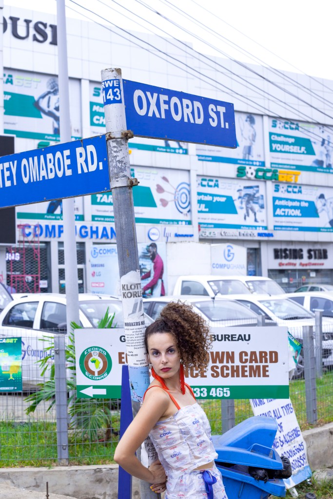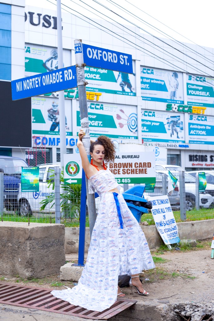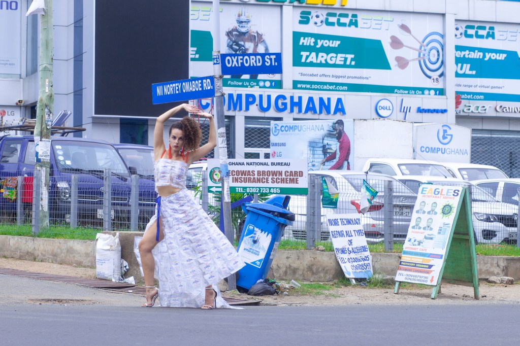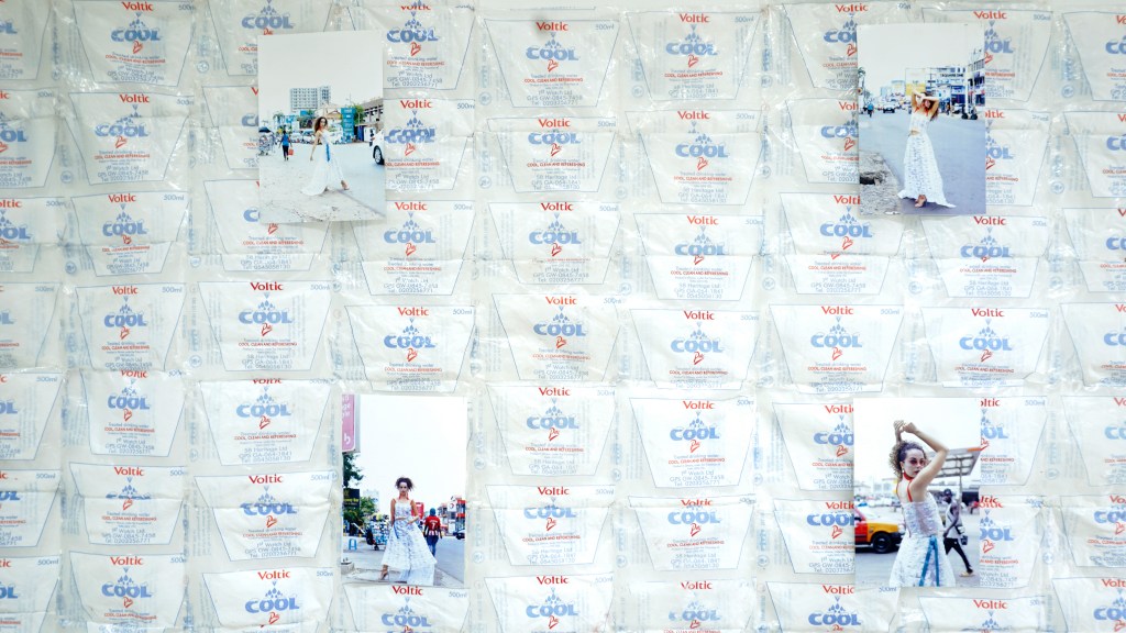 Environmental degradation leading to climate change and gender inequality stem both from Western capitalist, consumeristic and patriarchal paradigms. Can we imagine and seek an alternative, viable for all? Repurposing the water sachets, I created a wearable garment. With a crew of creatives, we took photographs during a procession along Oxford Street. A non-performance took place on March 28th, without audience, just witnesses to an absurd act. We attempted to capture a glimpse of an alternate reality. An utopia where this garment is a dress, this woman is a model, and Oxford street can be the iconic set of a high-fashion photoshoot. In this utopia, can we imagine enough running drinkable water for everyone?