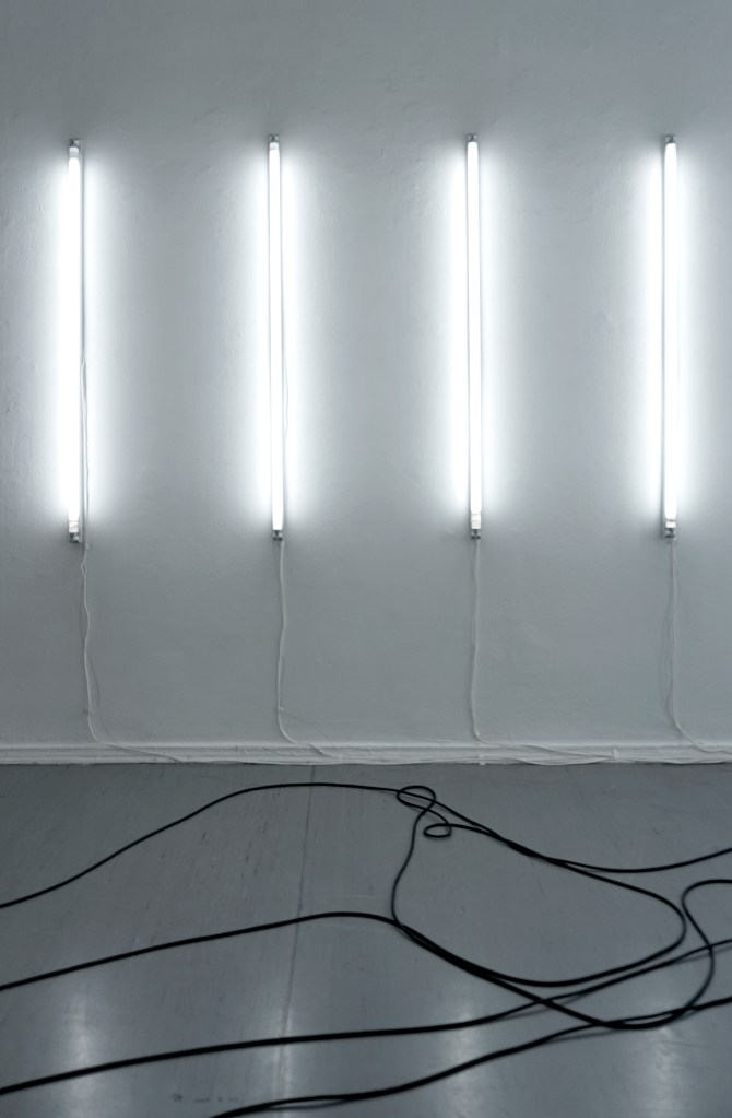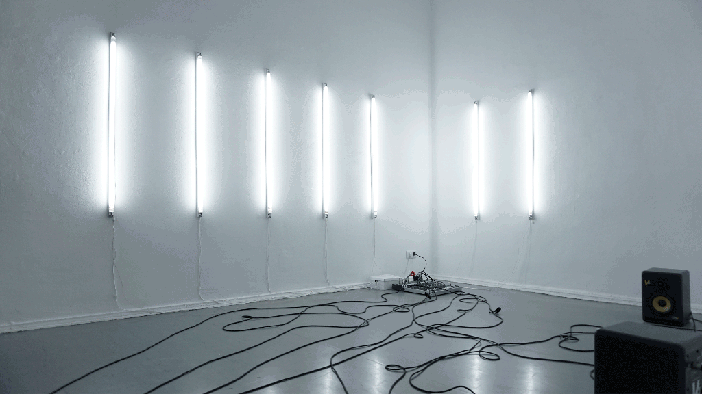 A light – sound installation consisting of seven lights, speakers and cables.