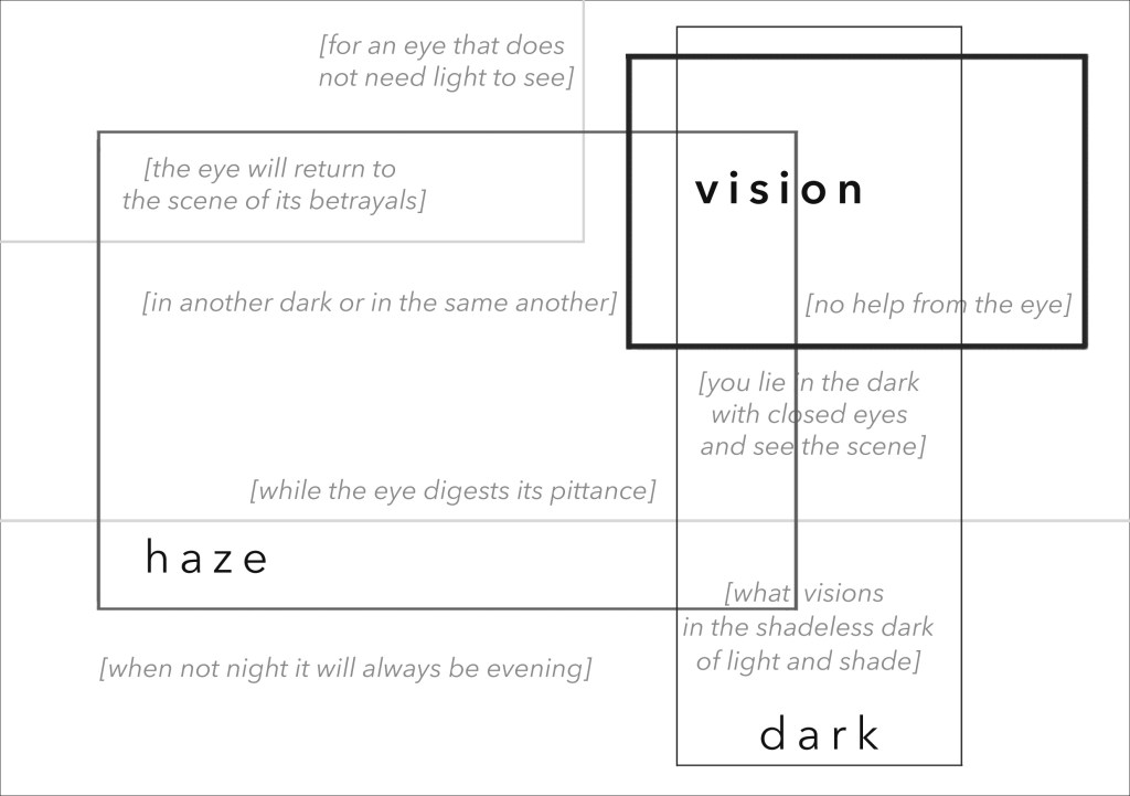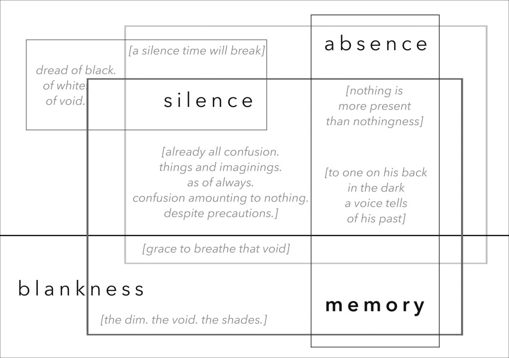 The installation is the Diploma Project that I presented at the School of Architecture at the National Technical University of Athens. After the late trilogy of Samuel Beckett, Nohow On, we meditate upon the spatiality of the inherently impossible act to perceive oneself. The residue of the eye, the word and the memory. The dim void. How to proceed when all is exhausted? A voice of pure silence.